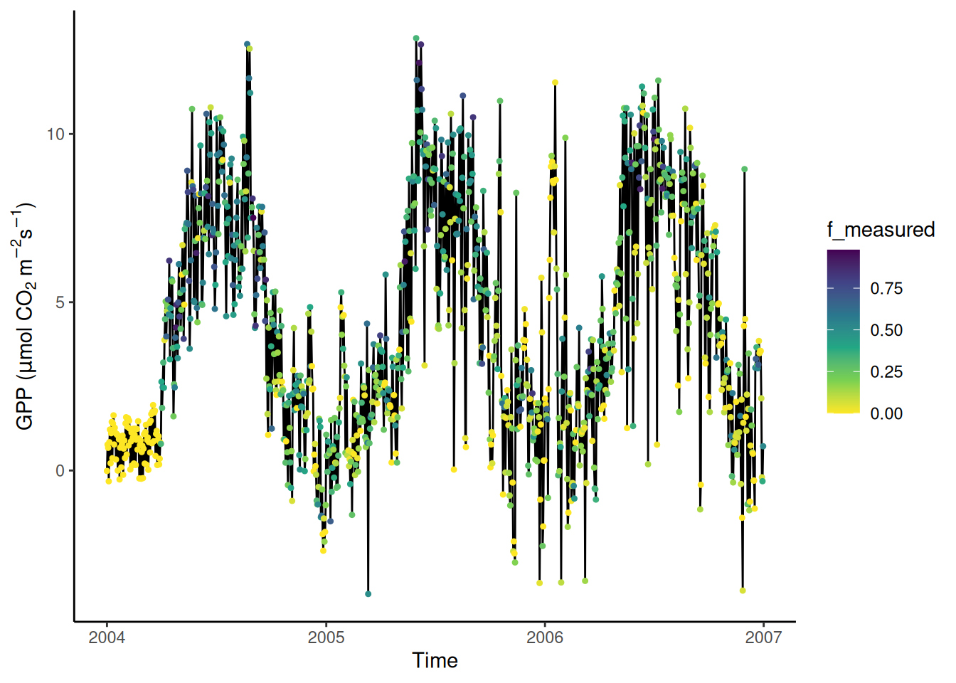 In this chapter, we will be working mainly with the same half-hourly time series data of ecosystem-atmosphere fluxes and parallel measurements of meteorological variables - as in Chapter 2 and Chapter 4. For time series data, the entry point of the exploratory data analysis cycle may be a visualization of some variable of interest (here GPP_NT_VUT_REF) against time: