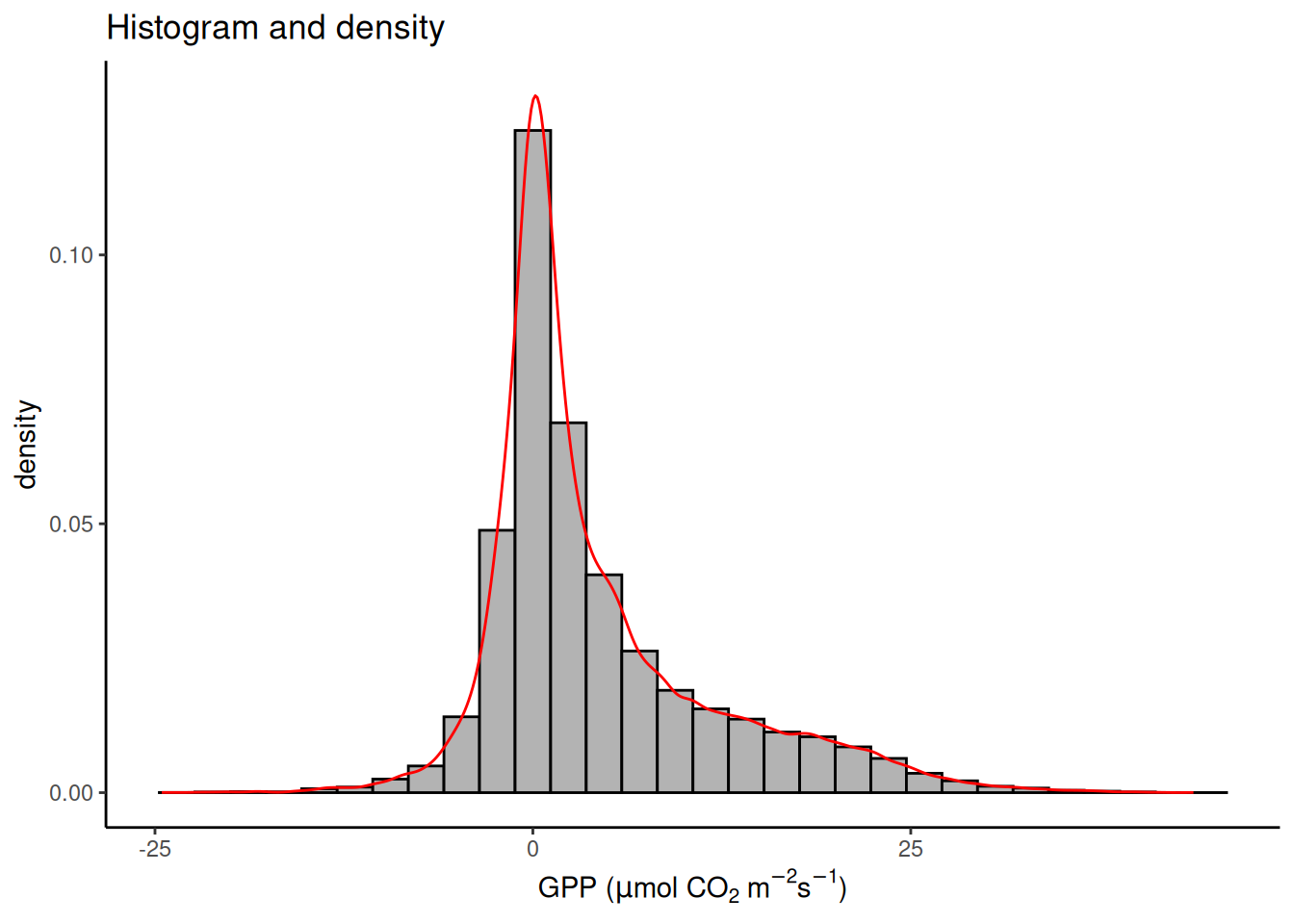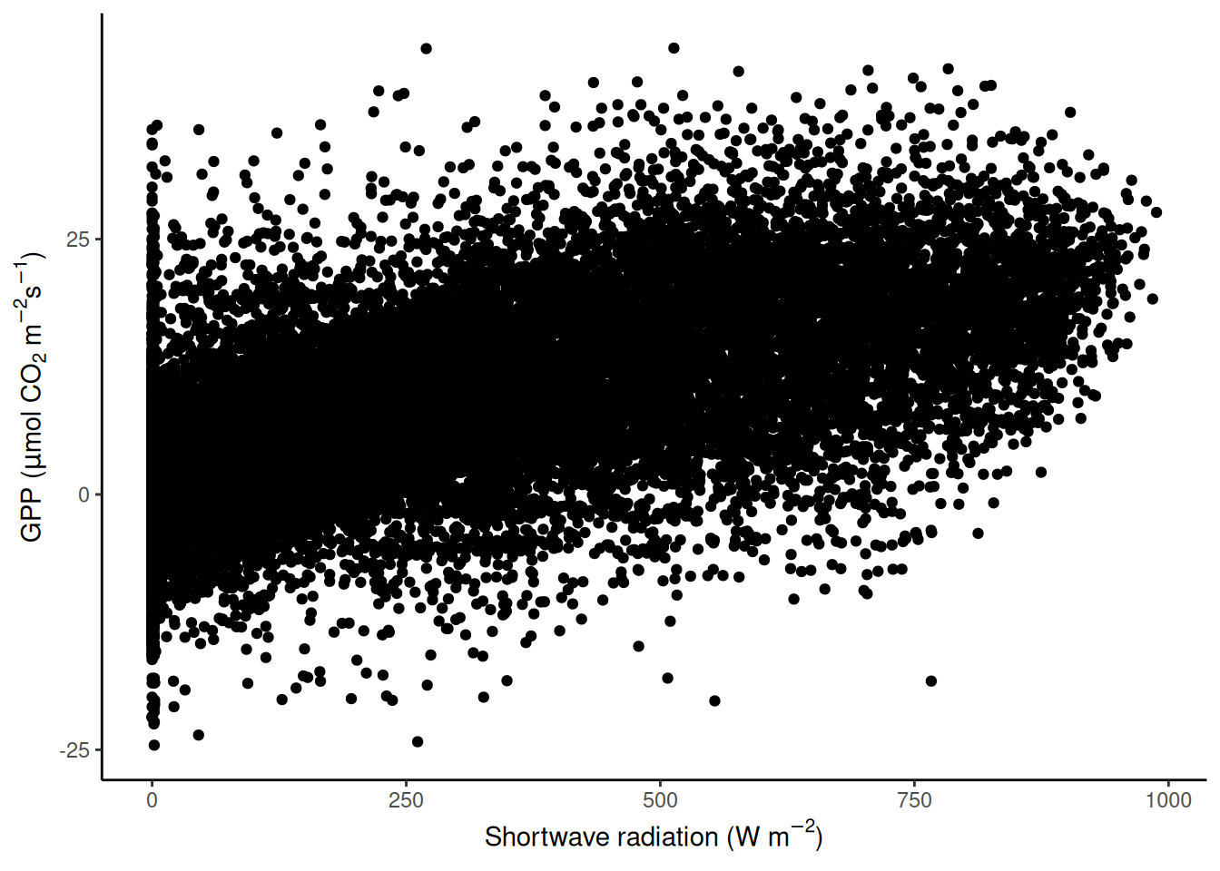lm(GPP_NT_VUT_REF ~ SW_IN_F, data = half_hourly_fluxes)and obtain the residuals from the object returned by thelm()function (see ‘Value’ in its help page).