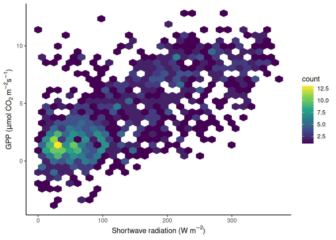To avoid obscuring important details about the data, we may want to visualise the density of points. We want to plot how many points fall within bins of a certain range of values in GPP and shortwave radiation, or, in other words, within grid cells in the GPP-radiation space. We can visualize the data, for example, with a raster plot that measures the density using stat_density_2d() or with a binning into hexagonal cells using the simple geom_hex() layer.