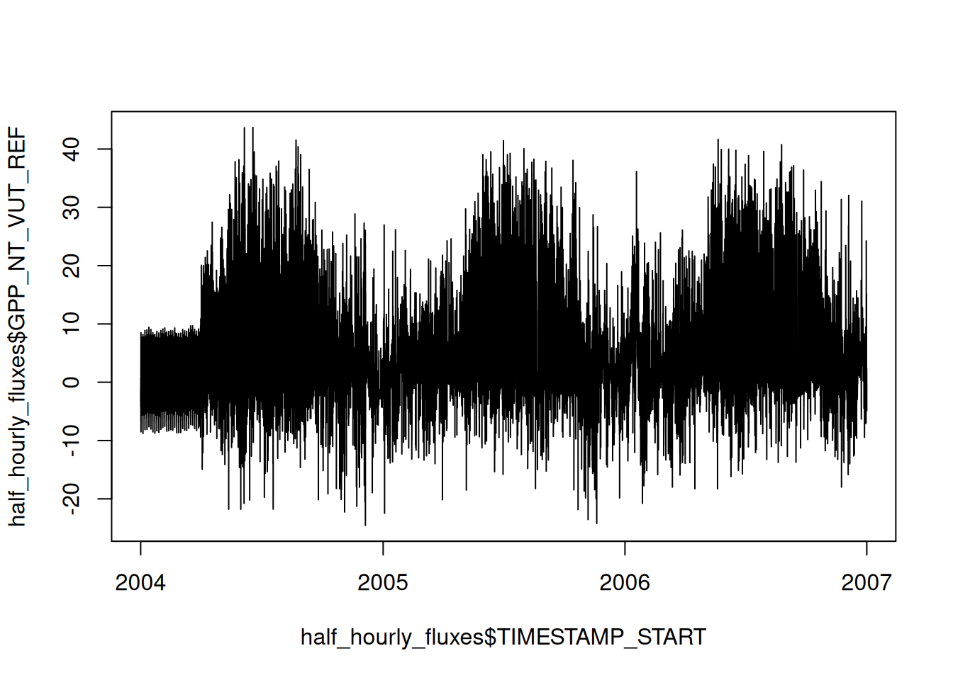 plot(half_hourly_fluxes$TIMESTAMP_START, half_hourly_fluxes$GPP_NT_VUT_REF, type = "l")