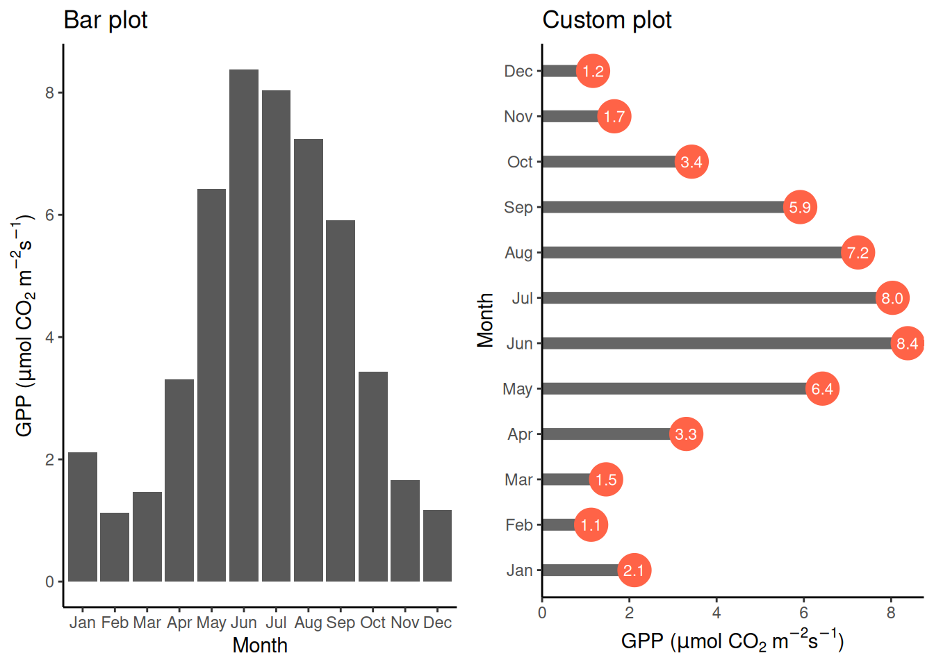 Probably the simplest case of data visualization is where a single value is shown across a categorical variable. This calls for a bar plot (geom_bar()). In the example below, we plot the mean GPP for each month. The “custom plot” shown below is a demonstration for what you can do by combining different elements with {ggplot2}. Try to understand the command for creating the object plot_2. Both examples are based on the data frame daily_fluxes which we created in Chapter 4.