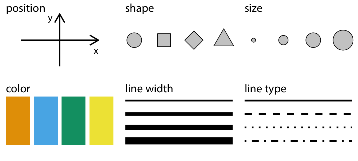 - Categorical variables: shape, color (a discrete set of colors), line type, etc.