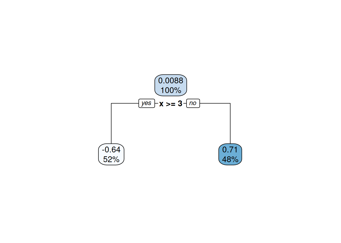 As a tree grows, splits are recursively added. In our example, only one predictor variable is available. The splits are therefore performed always on the same variable, splitting up \(X\) further.