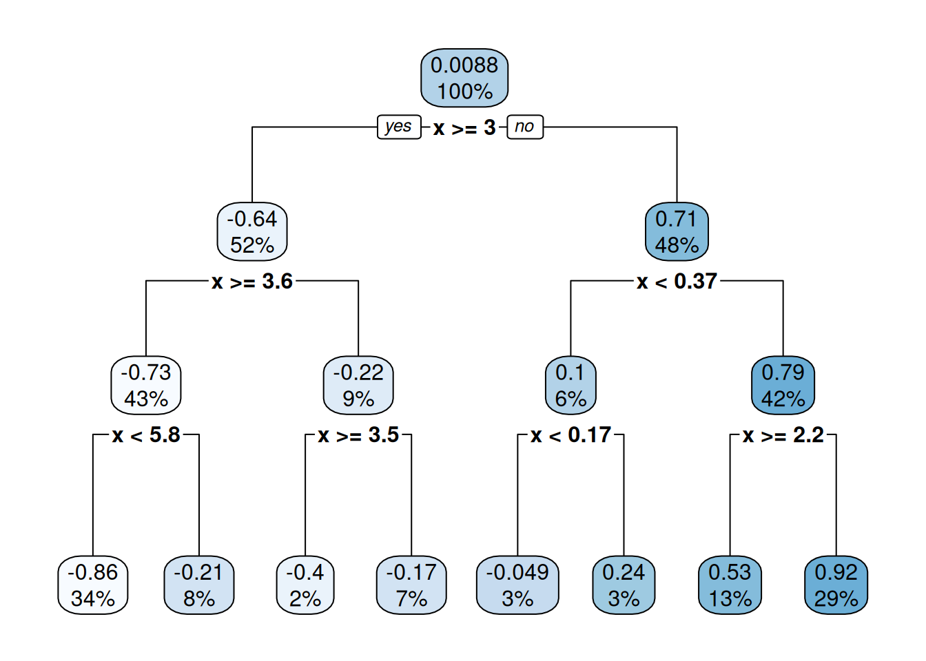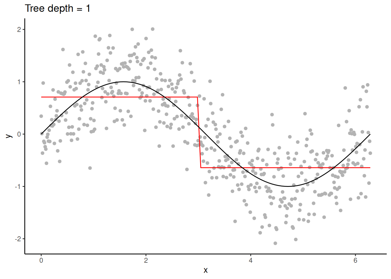 Just as a forest consists of trees, a Random Forest model consists of decision trees. Therefore, let’s start with a decision tree, also known as CART (classification and regression tree). Consider a similar example as in Chapter 10 where we fitted a function \(Y = f(X)\) with polynomials. Instead, here we fit it with a decision tree. The tree grows by successively splitting (branching) the predictor range (\(X\)) into binary classes (two regions along \(X\)) and predicting a different and constant value \(c\) for the target variable on either side of the split. The location of the split is chosen such that the overall error between the observed response (\(Y_i\)) and the predicted constant (\(c_i\)) is minimized. The error is determined based on whether we’re dealing with a regression or a classification problem.