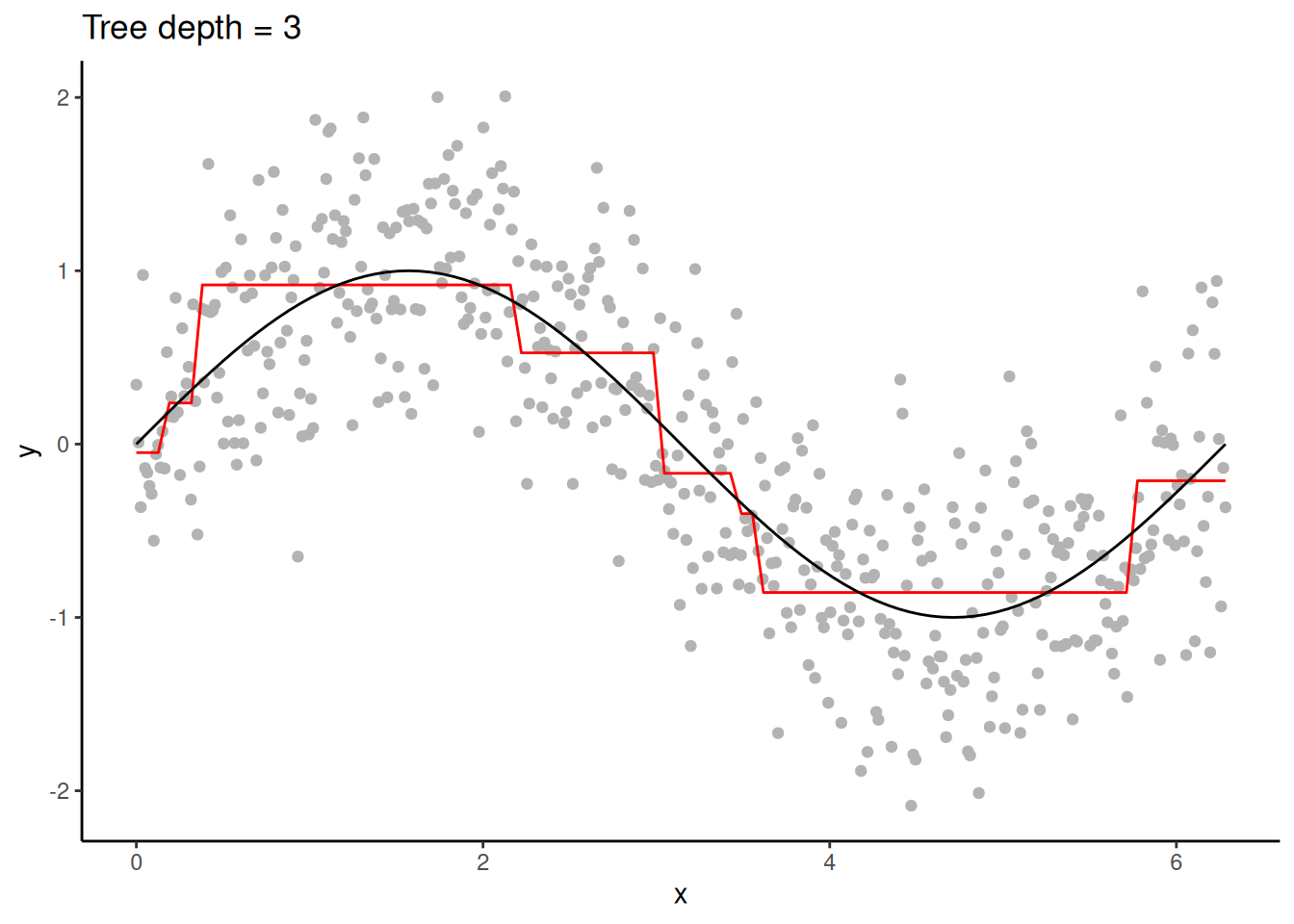 The number of variables to consider at each split is a hyperparameter of the Random Forest algorithm, commonly named \(m_\text{try}\). In the example below, we use the implementation in the {ranger} package (wrapped with {caret}), where the respective model fitting function has a hyperparameter mtry. Common default values are \(m_\text{try} = p/3\) for regression and \(m_\text{try} = \sqrt{p}\) for classification, where \(p\) is the number of predictors. Model complexity is controlled by the depth of the trees. Depending on the implementation of the Random Forest algorithm, this is governed not by explicitly specifying the tree depth, but by setting the number of observations in the leaf node. In the {ranger} package, the respective hyperparamter is min.node.size. The number of trees is another hyperparameter and affects predictions similarly as described above for bagging.