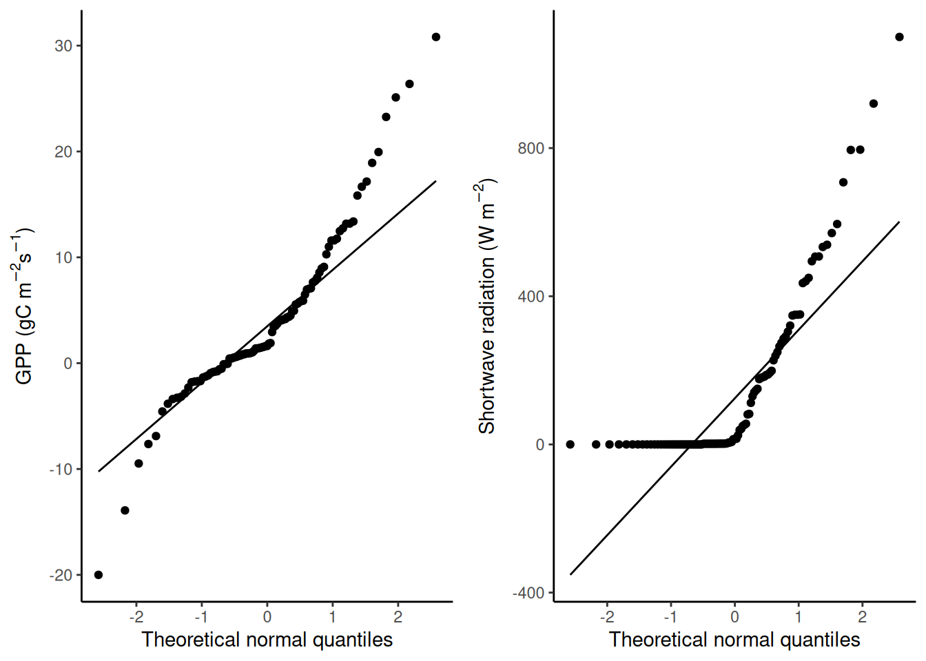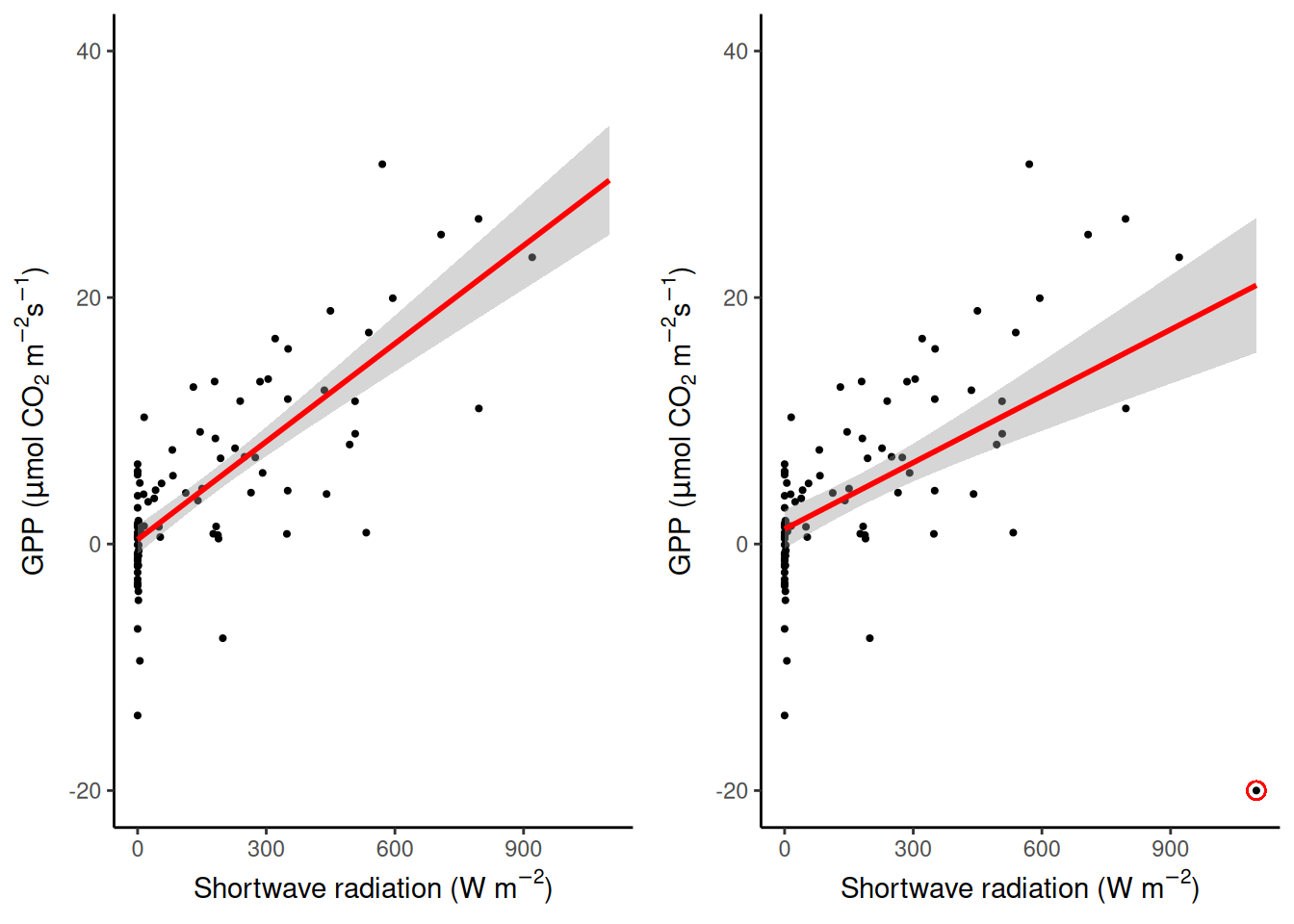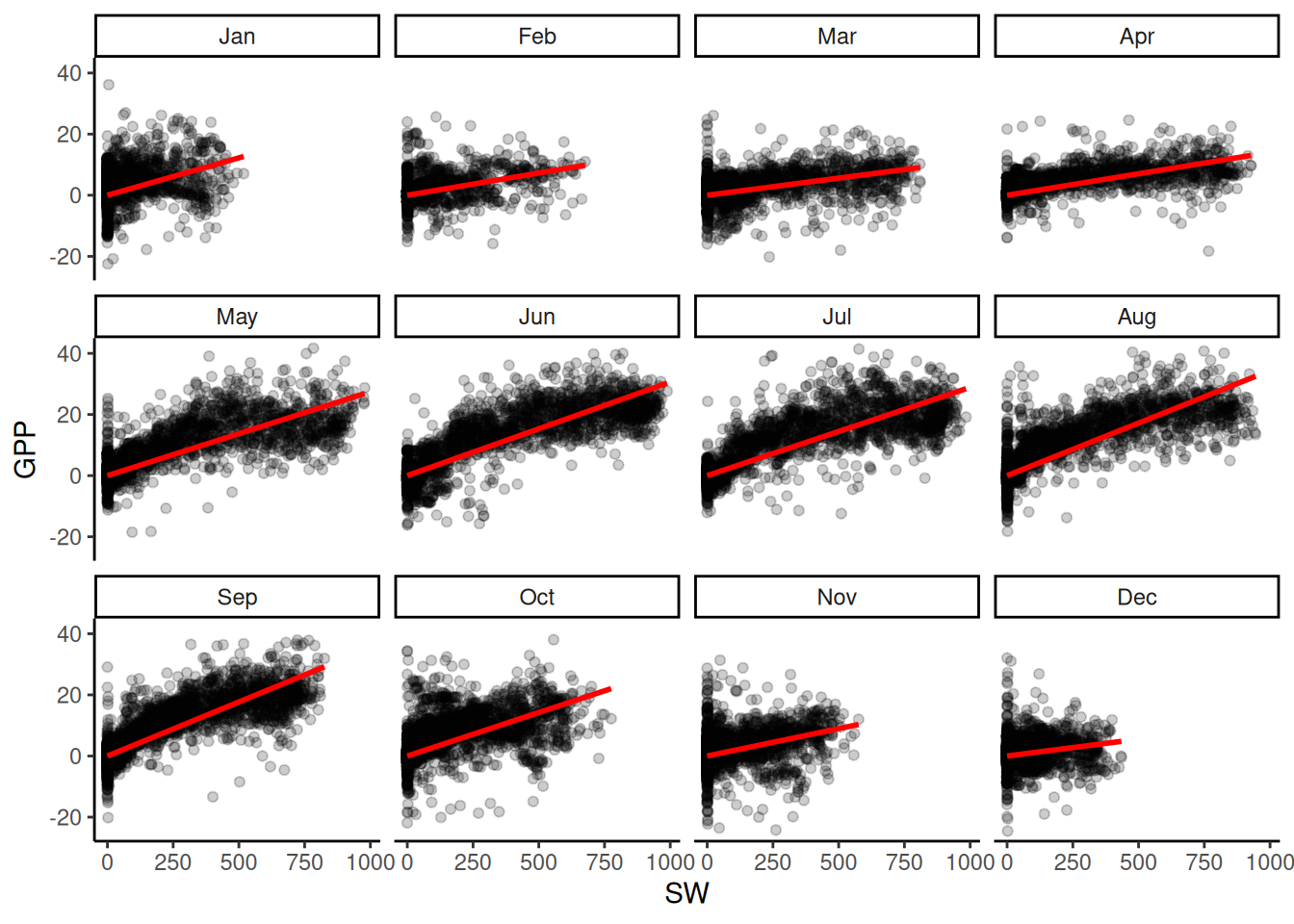 For example, we can try to explain the relationship between GPP and short wave radiation, like in Chapter 5. The figure below shows a cloud of data points, and a straight line predicting GPP based on observed shortwave radiation values.
