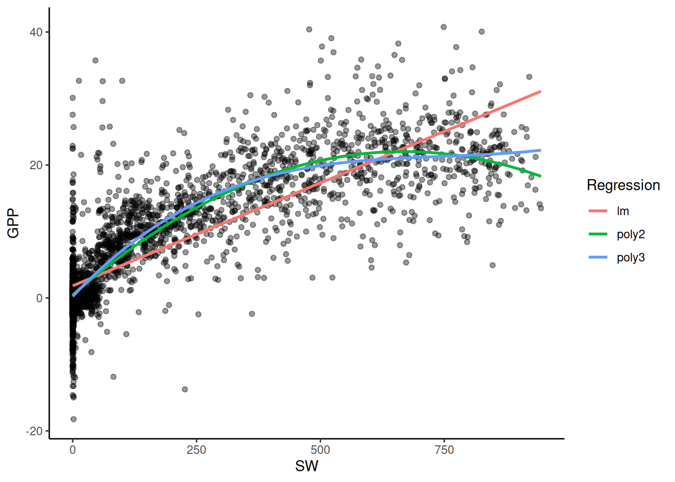 linmod2 <- lm(GPP_NT_VUT_REF ~ SW_IN_F + VPD_F + TA_F, data = df)The shorthand for including all predictors that are available in the data (here, all columns other than GPP_NT_VUT_REF in df), we can write: