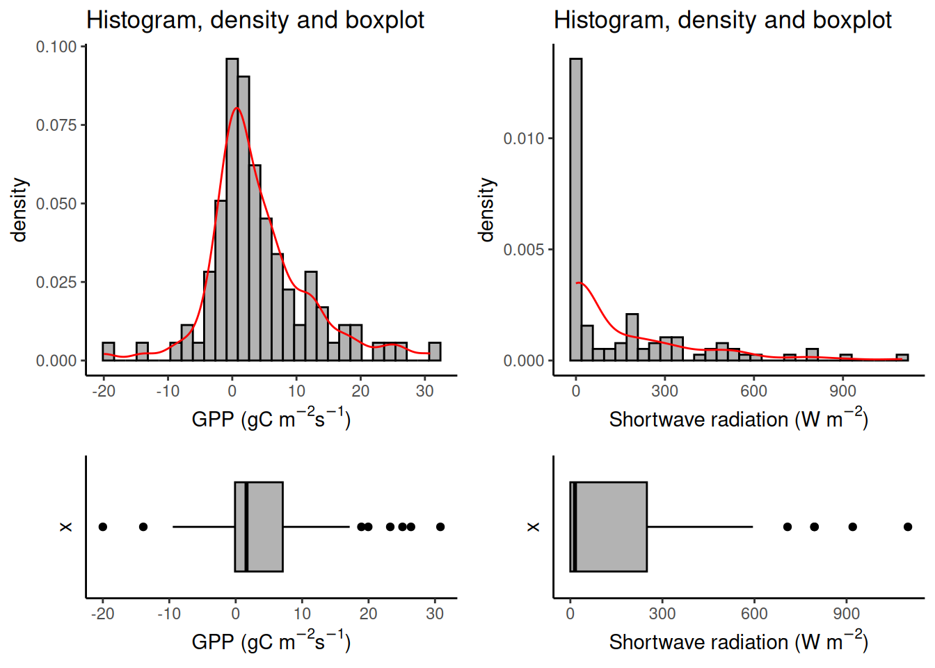 An advantage of linear regression is that the coefficients provide information that is straight-forward to interpret. We’ve seen above, that GPP_NT_VUT_REF increases by 0.0255 for a unit increase in SW_IN_F. Of course, the units of the coefficients depend on the units of GPP_NT_VUT_REF and SW_IN_F. This has the advantage that the data does not need to be normalised. That is, a linear regression model with the same predictive skills can be found, irrespective of whether GPP_NT_VUT_REF is given in (g C m\(^{-2}\)s\(^{-1}\)) or in (t C km\(^{-2}\) year\(^{-1}\)).