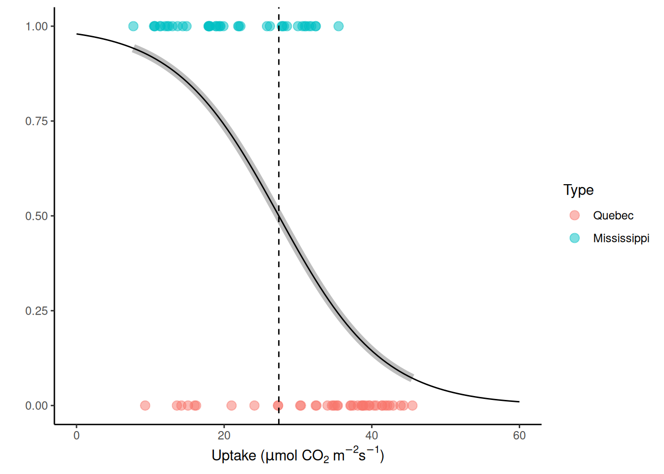 glm(formula = Type ~ uptake, family = binomial(link = logit),