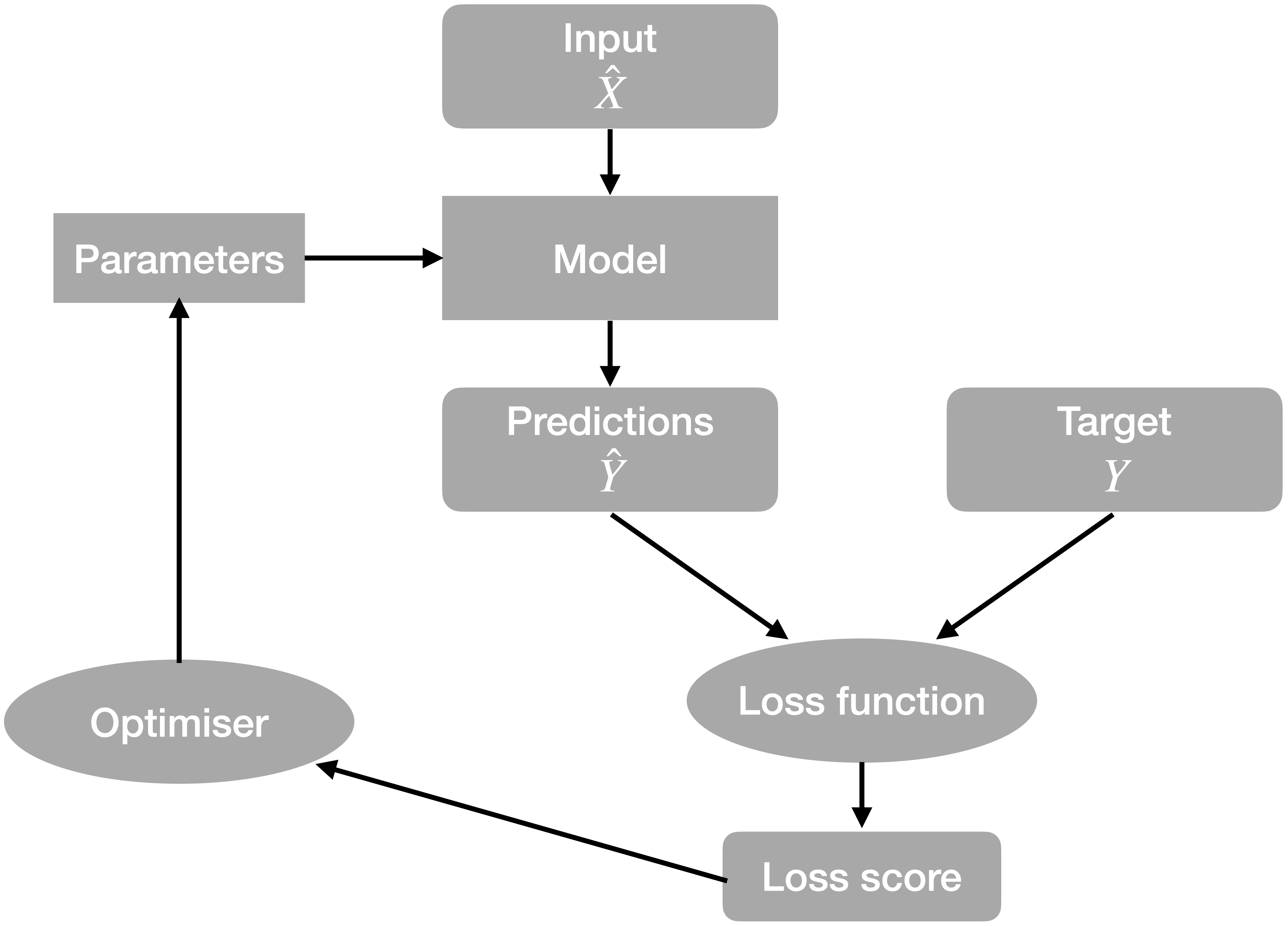 - An algorithm (the optimiser) to find the best set of parameters that minimize the loss
