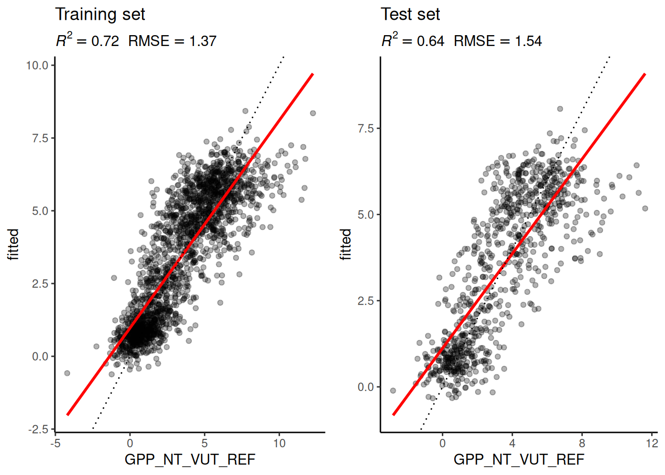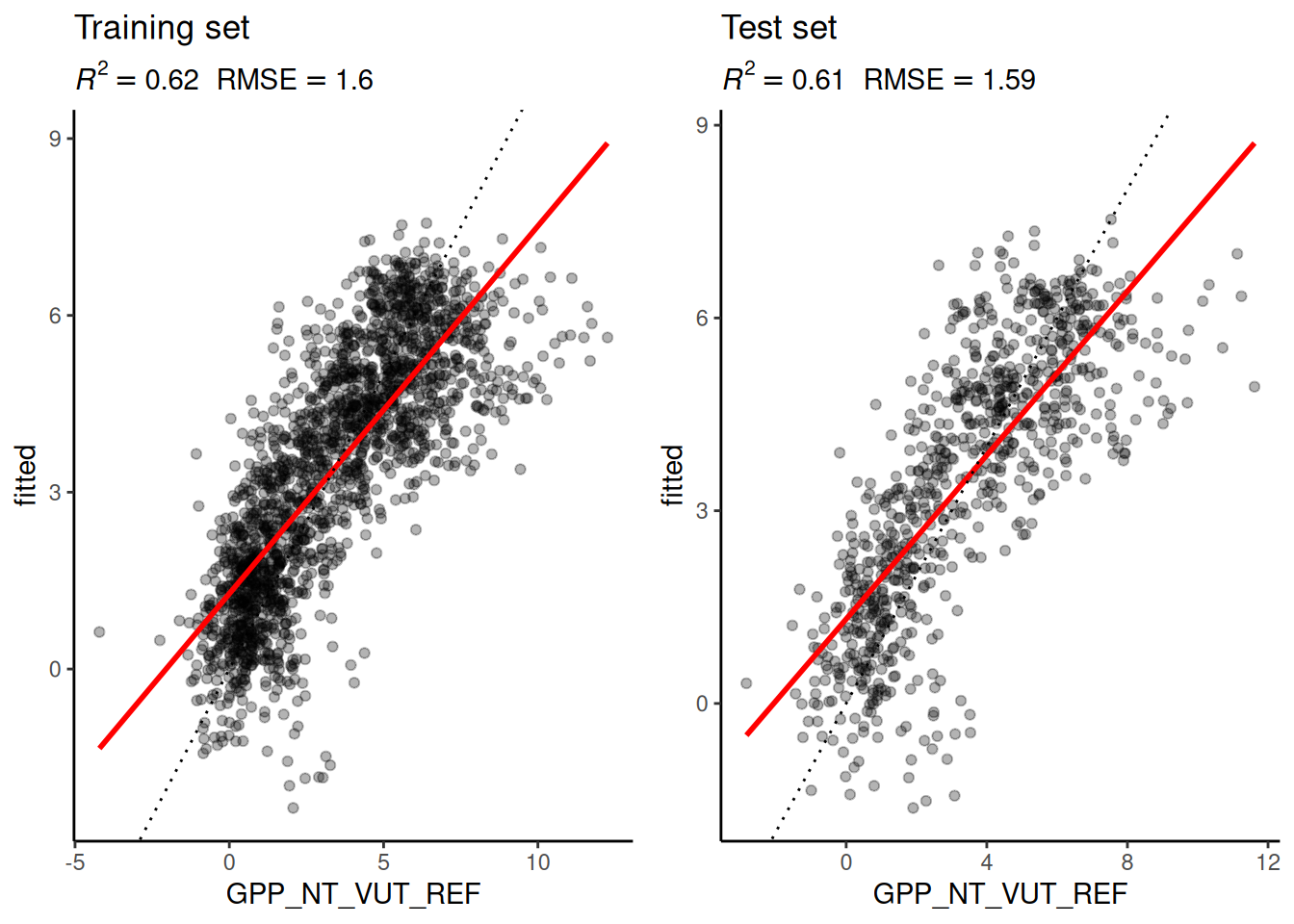 eval_model(mod = mod_lm, df_train = daily_fluxes_train, df_test = daily_fluxes_test)