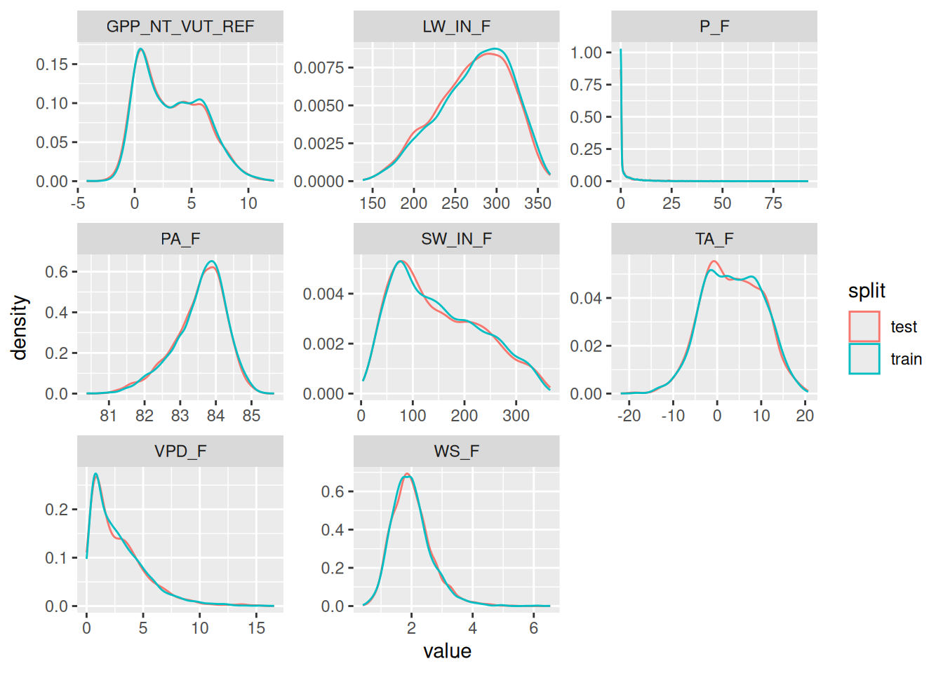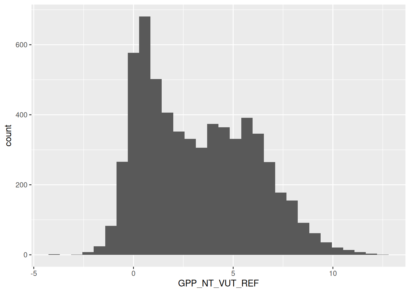 daily_fluxes) was cleaned based on quality control information upon reading the data at the beginning of this Chapter. Before modelling, we’re checking the distribution of the target value here again to make sure it is “well-behaved”. - Imputation: We drop rows with missing data for model training, instead of imputing them.