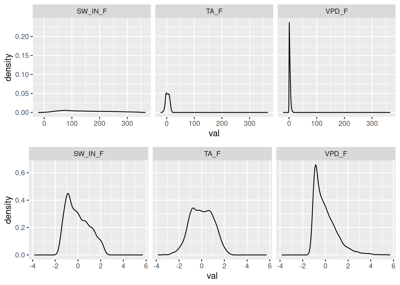We’re returning to ecosystem flux data that we’ve used in Chapter 4 and Chapter 5. Here, we’re using daily data from the evergreen site in Davos, Switzerland (CH-Dav) to avoid effects of seasonally varying foliage cover for which the data does not contain information. To address such additional effects, we would have to, for example, combine the flux and meteorological data with remotely sensed surface greenness data.