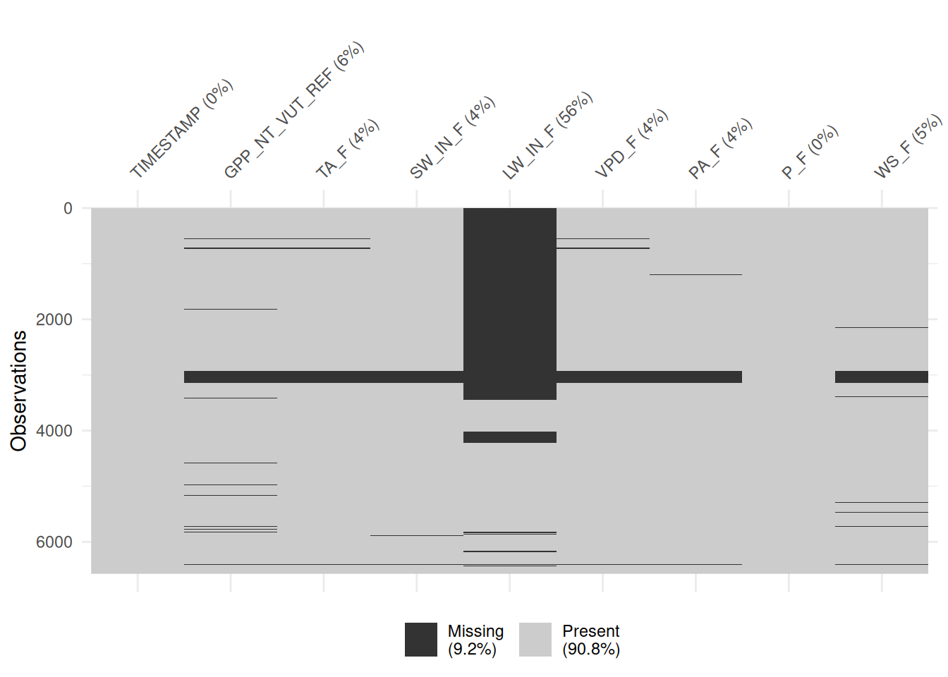 LW_IN_Fhas lots of missing values and - given a priori knowledge is not critical for predicting GPP and we’ll drop it. - Data cleaning: Data (