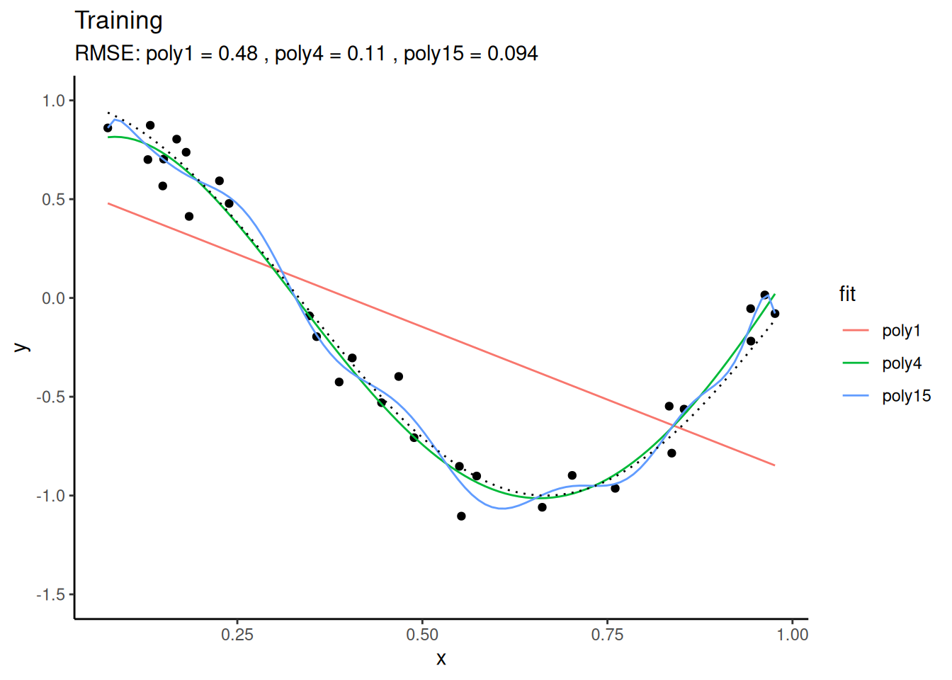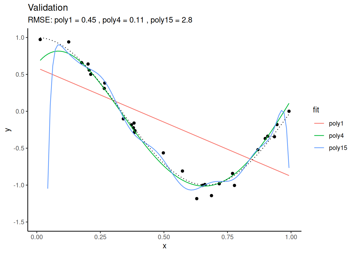 You see that, using the test set, we find that “poly4” actually performs best - it has a much lower RMSE than “poly15”. Apparently, “poly15” was overfitted. Apparently, it used its flexibility to fit not only the shape of the true underlying relationship, but also the observation errors on top of it. This has the implication that, when this model is used for making predictions for data that was not used for training, it will yield misguided predictions that are affected by the errors in the training set. This is the reason why “poly15” performed worse on the test set than the other models.