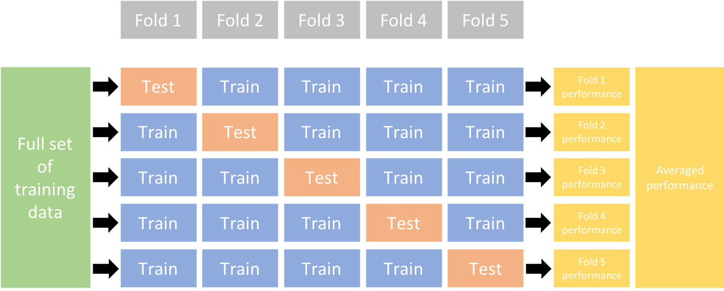 In k-fold cross validation, the training data is split into k equally sized subsets (folds). (Don’t confuse this k with the k in KNN.) Then, there will be k iterations, where each fold is used for validation once (while the remaining folds are used for training). An extreme case is leave-one-out cross validation, where k corresponds to the number of data points.