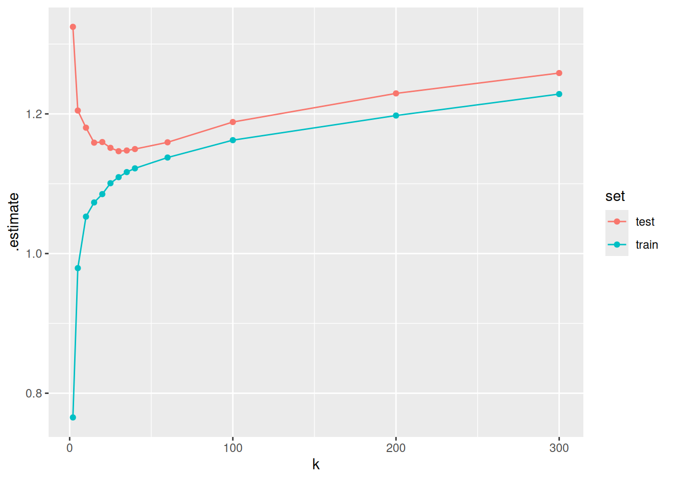 This illustrates that the model performance on the training set keeps improving as the model variance (as opposed to bias) increases - here as we go towards smaller \(k\). However, what counts for measuring out-of-sample model performance is the evaluation on the test set, which deteriorates with increasing model variance beyond a certain point.